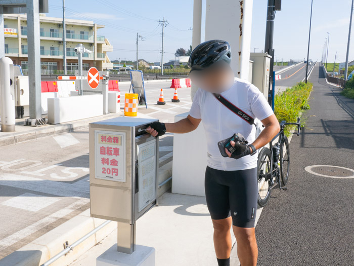 自転車の通行料は20円で、無人のボックスにお金を収めることになります。