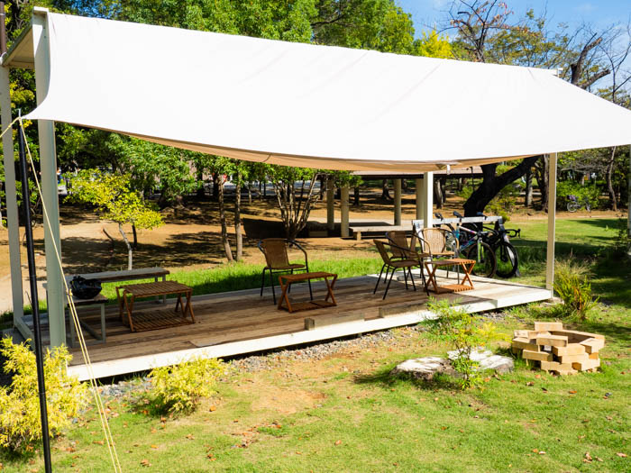 タープが張ってある屋根付きのスペースがあり、そこで座って休憩させていただきました。