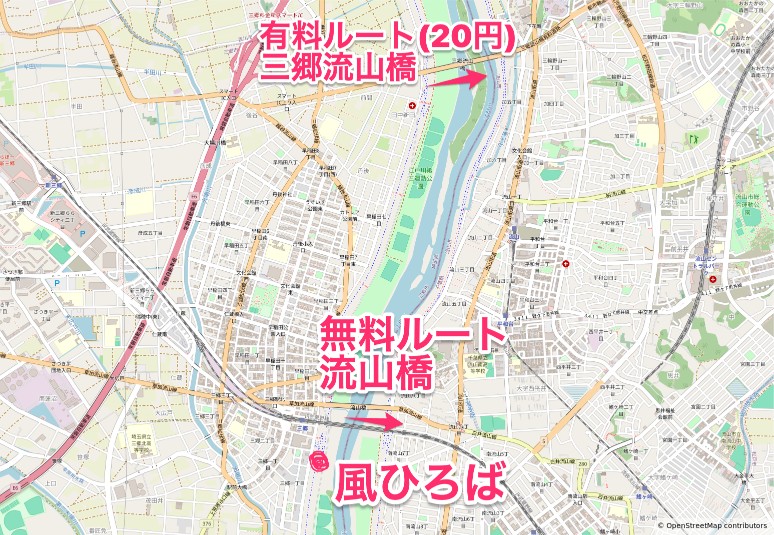 風ひろばの近くから渡るのであれば「流山橋」、少し先にいくと「三郷流山橋」から渡ることが可能。